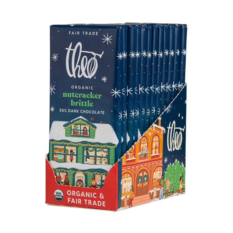 Organic nutcracker brittle 55% dark chocolate bar – rich 55% cacao with crunchy hazelnuts & sweet brittle pieces for salty, festive crunch. Fair trade, vegan gourmet holiday treat. buy organic nutcracker brittle online